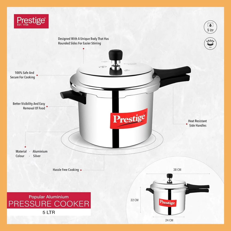 زودپز پرستیژ (Prestige) مدل Popular 5L با بدنه آلومینیوم خالص و طراحی ایمن، گزینهای مطمئن و بادوام برای پخت سریع و سالم غذاهای روزانه است. ظرفیت ۵ لیتری آن، انتخابی مناسب برای خانوادههای ۵ تا ۷ نفره محسوب میشود.