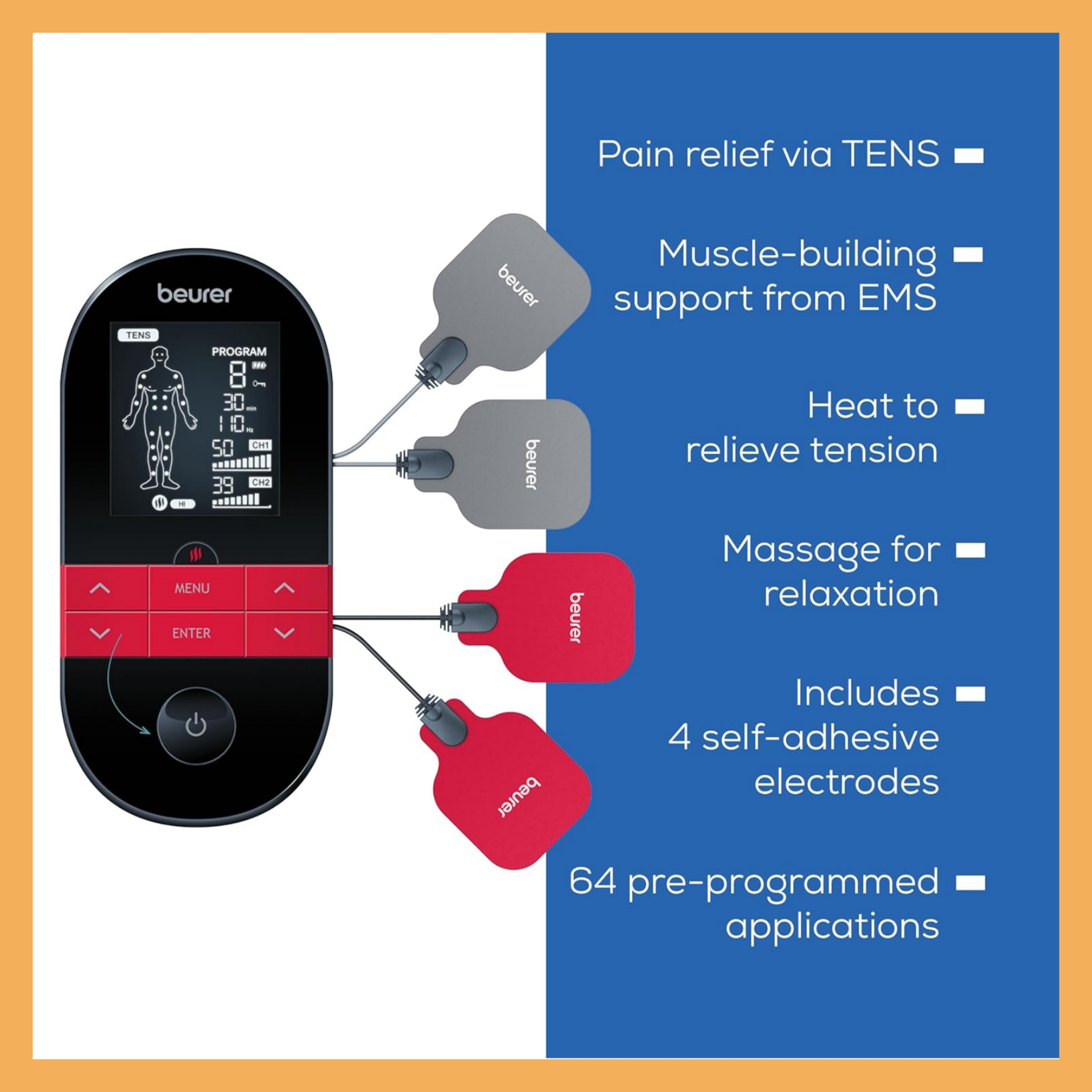 ماساژور دیجیتال بیورر EM59 با ترکیب فناوریهای TENS، EMS، ماساژ و گرمایش یک دستگاه کامل برای تسکین درد، تقویت عضلات و آرامش روزانه است.