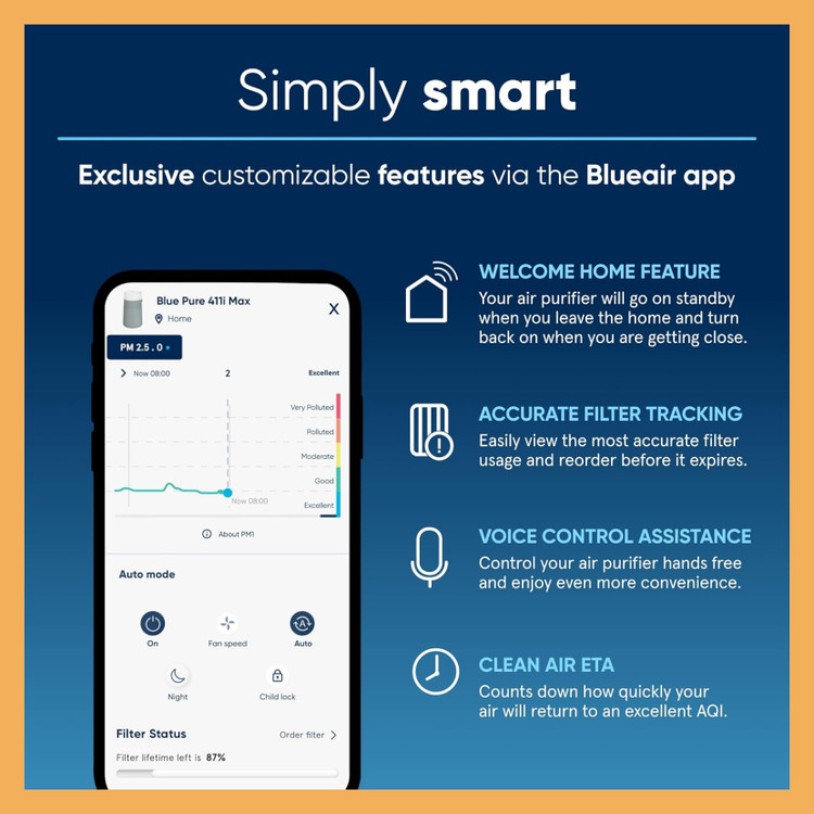 دستگاه تصفیه هوای Blueair Blue Pure 411i Max ترکیبی از طراحی مدرن، فیلتر قدرتمند HEPASilent و فناوری هوشمند است که برای فضاهای کوچک تا متوسط عملکردی بینقص دارد. این مدل با مصرف انرژی بسیار کم و صدای فوقالعاده پایین، انتخابی ایدهآل برای اتاق خوابها، دفاتر کار و کلینیکها است.