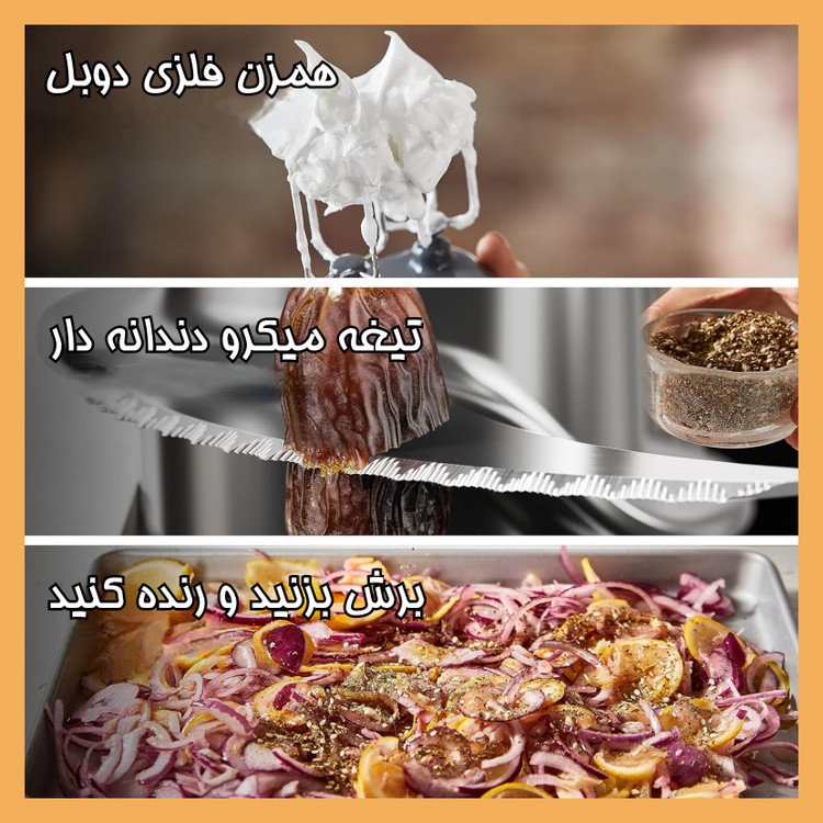 ⚙️ عملکردها: آبمرکباتگیری، خردکن، خمیرزن، رنده و برش ورقهای، مخلوطکن، همزن