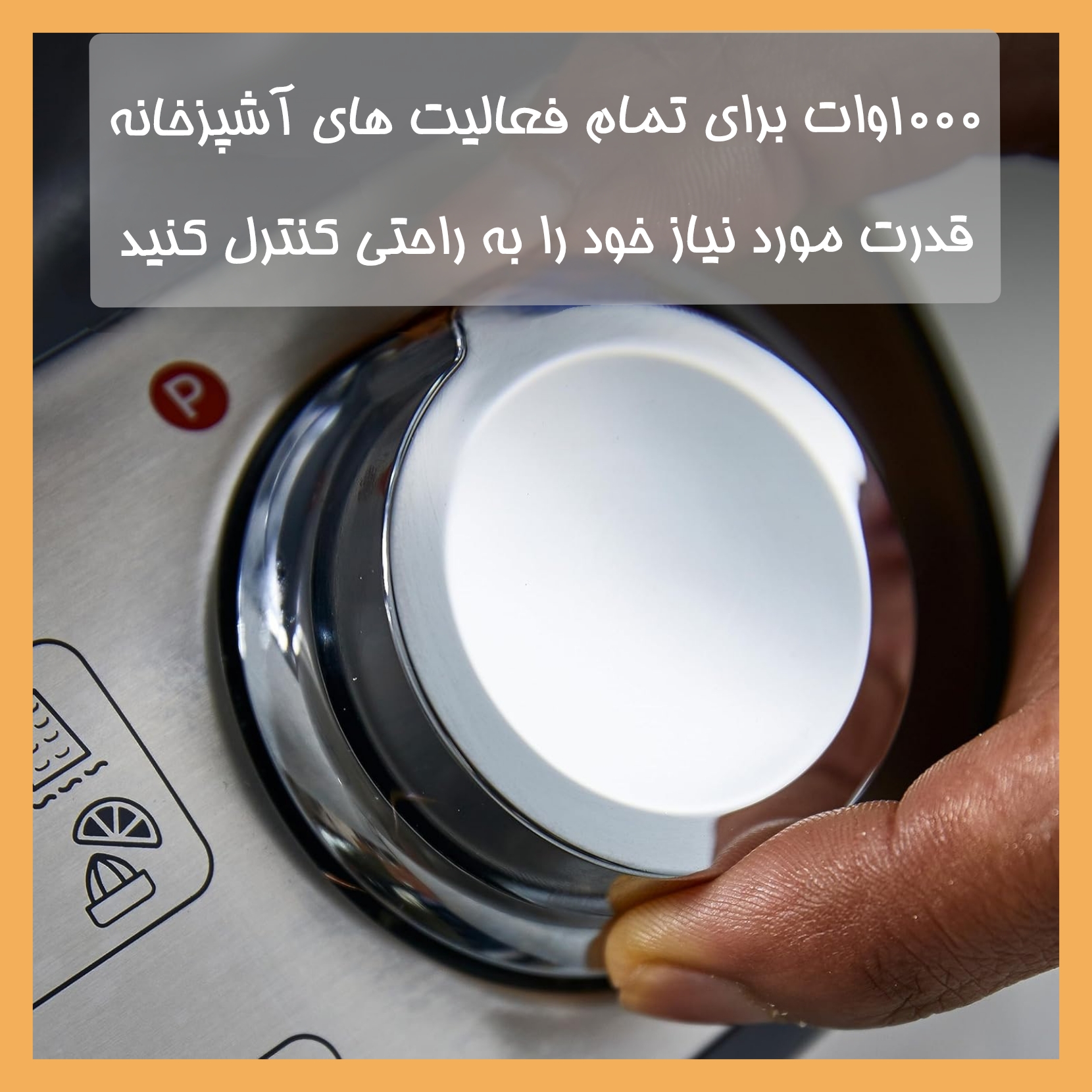 ✅ مزایا: موتور پرقدرت 1000 وات، عملکرد چندکاره، تیغه و دیسکهای استیل ضدزنگ، ترازو روی دستگاه، طراحی حرفهای