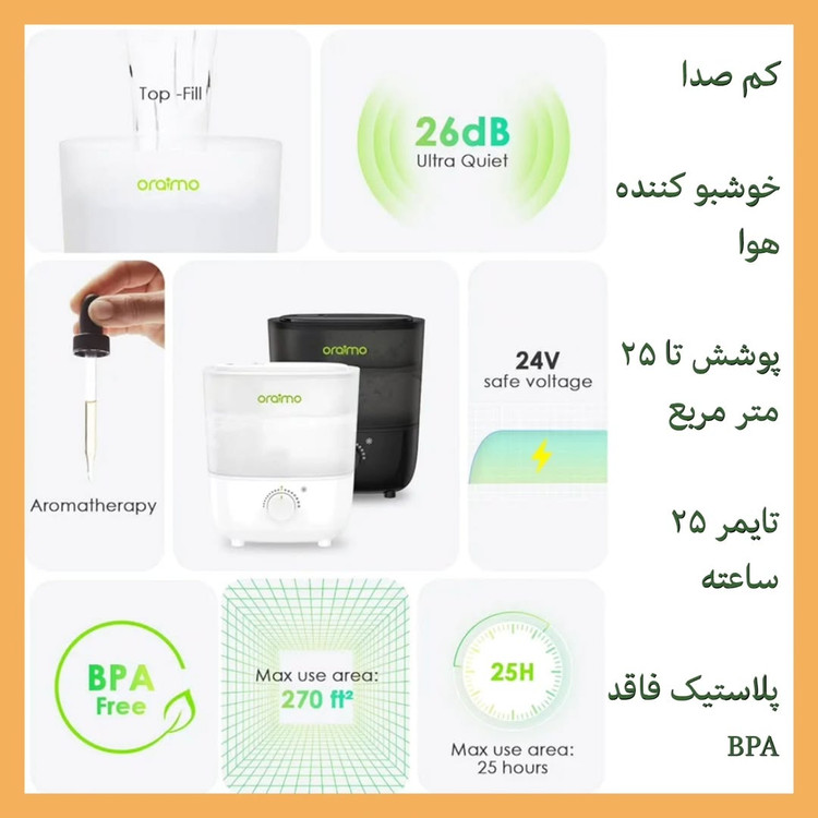 دستگاه بخور سرد Oraimo مدل OHMU02 یکی از مدلهای کارآمد و اقتصادی موجود در بازار است. با توجه به مخزن بزرگ 2.5 لیتری و قابلیت کارکرد چندساعته بدون نیاز به افزودن مجدد آب، گزینهای مناسب برای استفاده در اتاق خواب یا محیط کار است. صدای بسیار کم دستگاه باعث شده برای استفاده شبانه و کنار تخت کودک هم عالی باشد. امکان تنظیم بخار و تایمر نیز استفاده از آن را راحتتر کرده است.