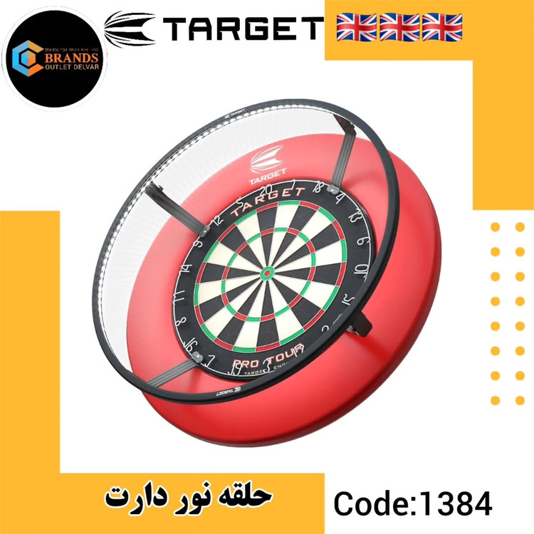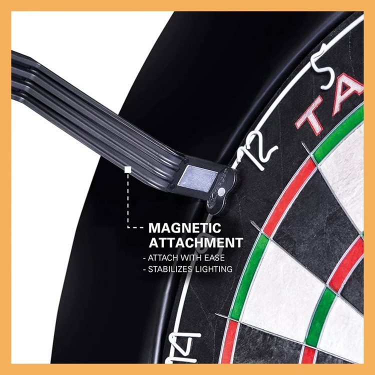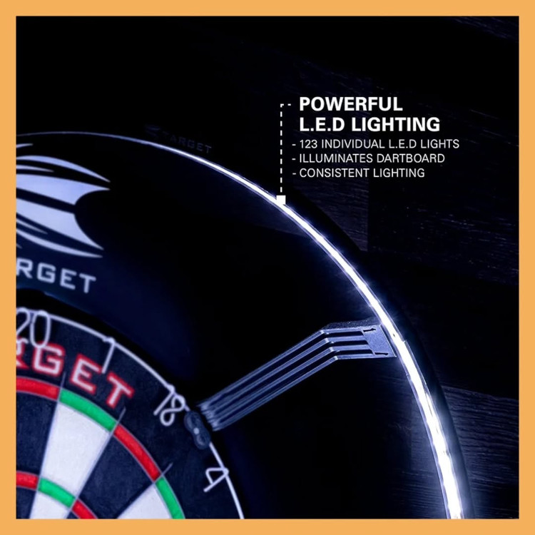 حلقه نور Target Corona Vision یکی از حرفهایترین سیستمهای نورپردازی مخصوص تخته دارت است. این مدل با استفاده از ۱۲۳ چراغ LED با نور سفید خالص، روشنایی یکنواخت و بدون سایهای ایجاد میکند که دقت پرتاب را بهطور محسوسی افزایش میدهد.